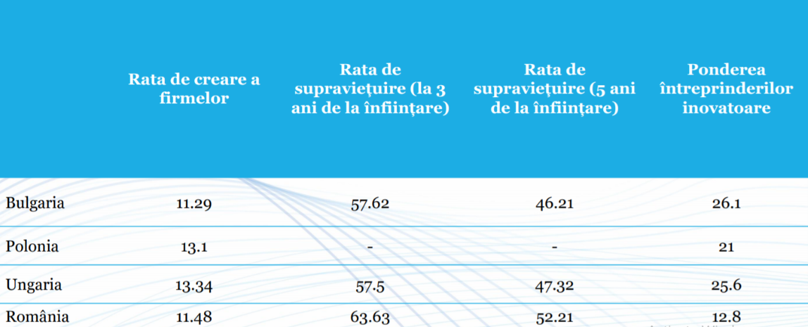 Dacă e să ne referim la statistica de mai jos, observăm că în țara noastră, rata de creare a firmelor este de de doar 11, 48%, în timp de rata de supraviețuire dupa 3, respectiv 5 ani are o medie undeva la 55%.