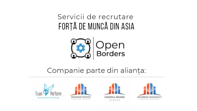 Open Borders face parte dintr-o alianță menită să acopere toate nevoile companiilor client, fapt pentru care clienții noștri beneficiază de reduceri și oferte exclusive oferite de: Train 2 Perform, Moldrom Finance, Cabinet de Avocat Daniela Arhire și Moldrom Insolvency. Completați formularul de contact de pe pagina nostră web pentru a beneficia de o evaluare a nevoilor companiei dumneavoastră legate de resursele umane și nu numai: https://openborders-hr.com/contact/